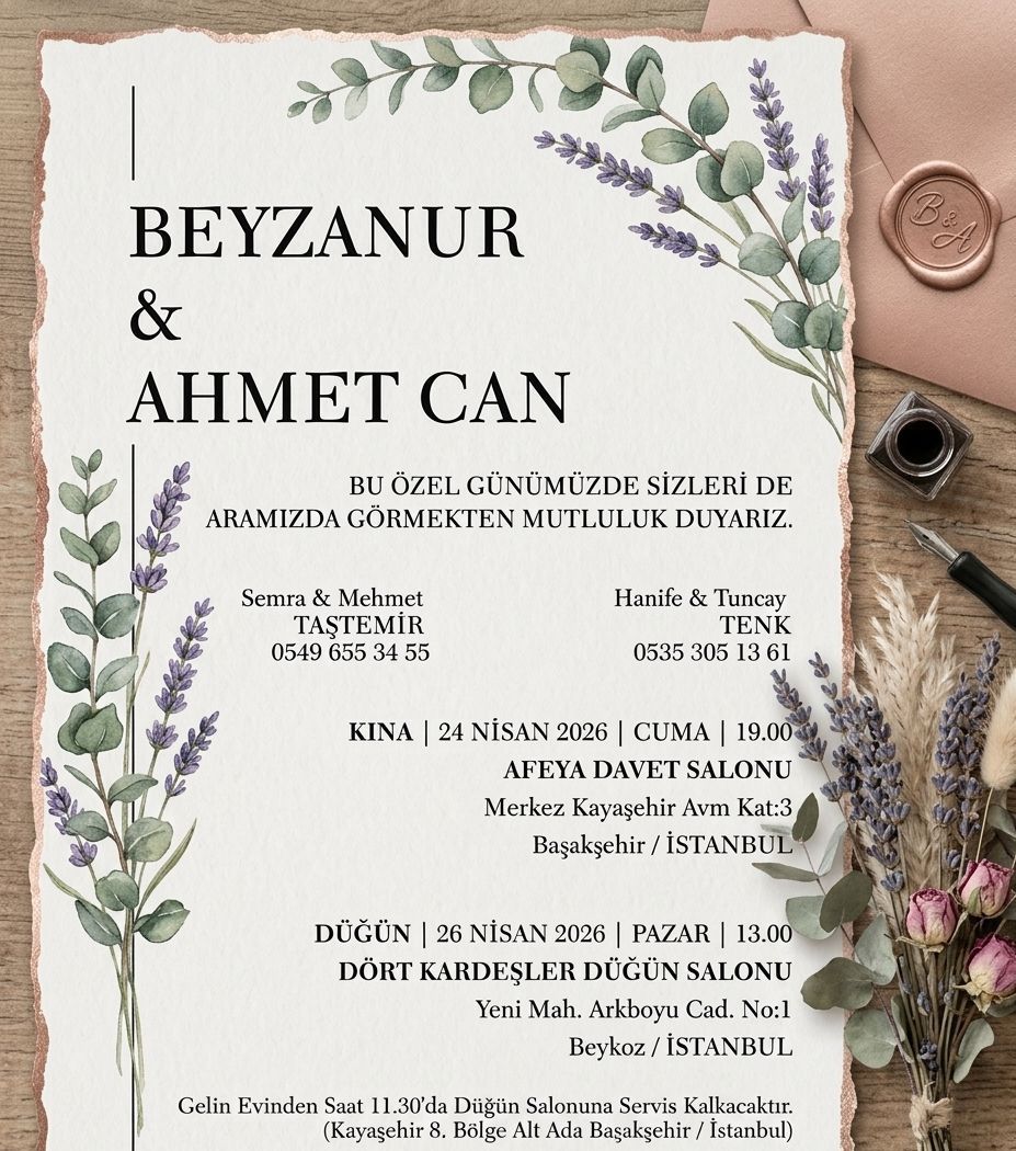 DÜĞÜN: 26 NİSAN 2026 PAZAR GÜNÜ 13:00-17:00 SAATLERİ ARASI DÖRT KARDEŞLER DÜĞÜN SALONUNDA OLACAKTIR