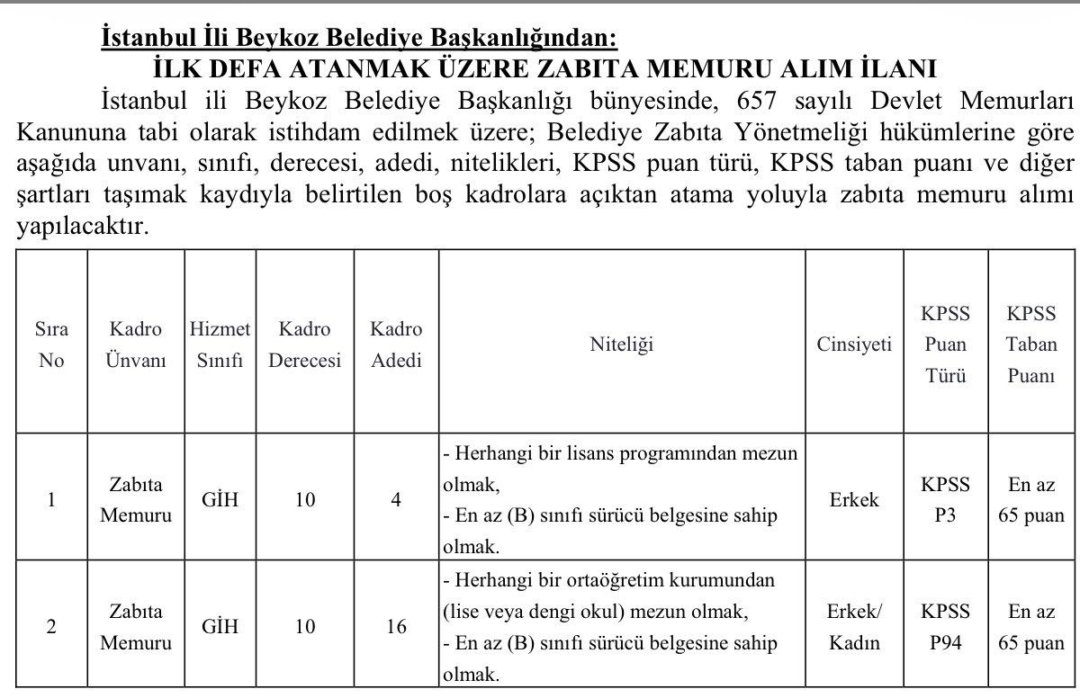 Beykoz Belediyesi, 657 sayılı devlet memuru kadrosunda istihdam edilmek üzere açıktan atama yoluyla 4 erkek, 16 kadın zabıta memuru alacak.