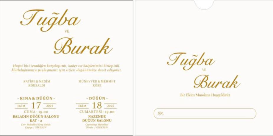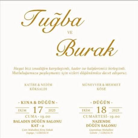 DÜĞÜN:18 EKİM 2025 CUMARTESİ GÜNÜ 19:00-23:00 SAATLERİ ARASI GÖRELE NAZENDE DÜĞÜN SALONUNDA olacaktır