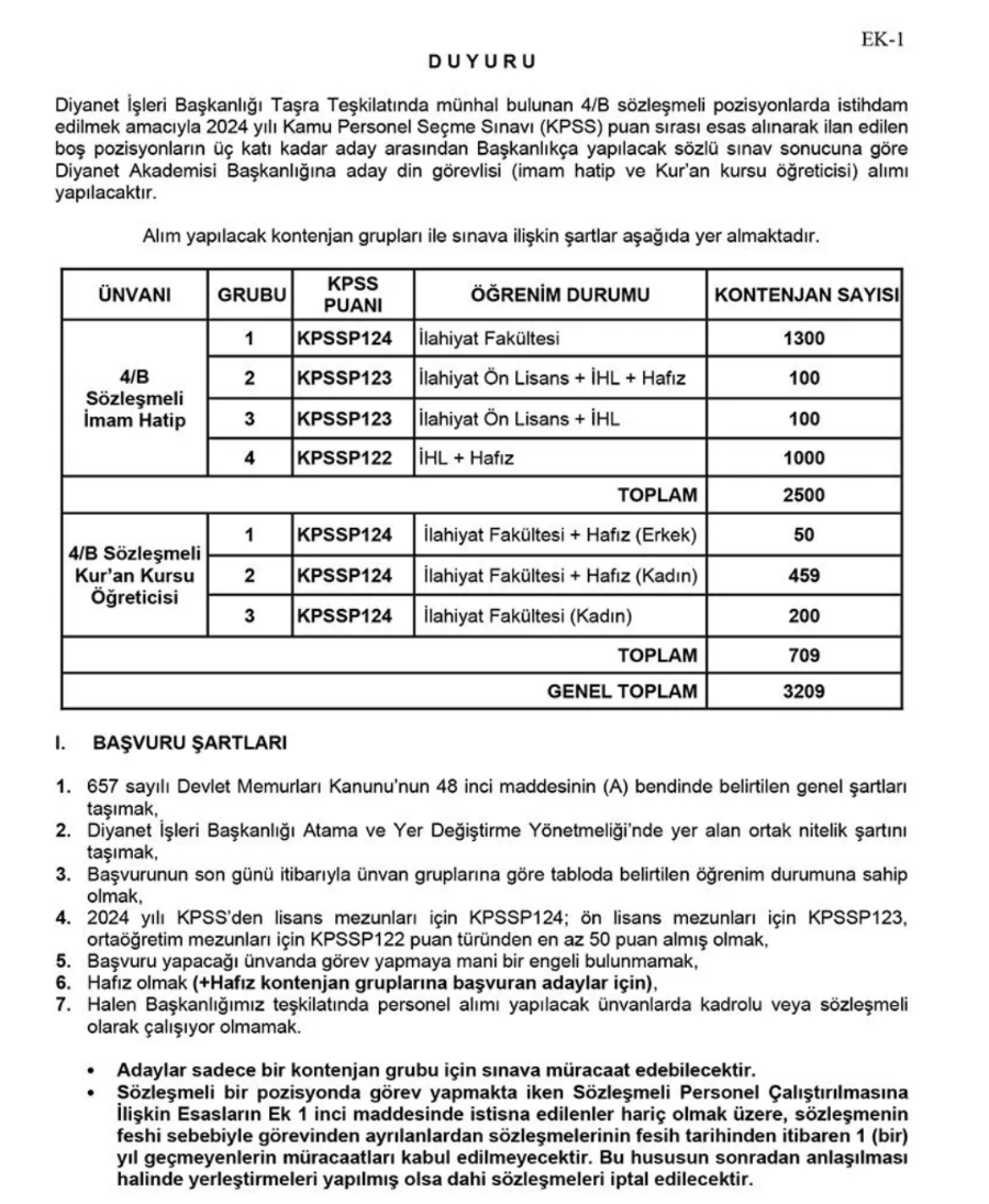 Diyanet İşleri Başkanlığı Taşra Teşkilatında münhal bulunan 4/B sözleşmeli pozisyonlarda istihdam edilmek amacıyla 2024 yılı Kamu Personel Seçme Sınavı (KPSS) puan sırası esas alınarak ilan edilen boş pozisyonların üç katı kadar aday arasından Başkanlıkça yapılacak sözlü sınav sonucuna göre Diyanet Akademisi Başkanlığına aday din görevlisi (imam hatip ve Kur’an kursu öğreticisi) alımı yapılacak.