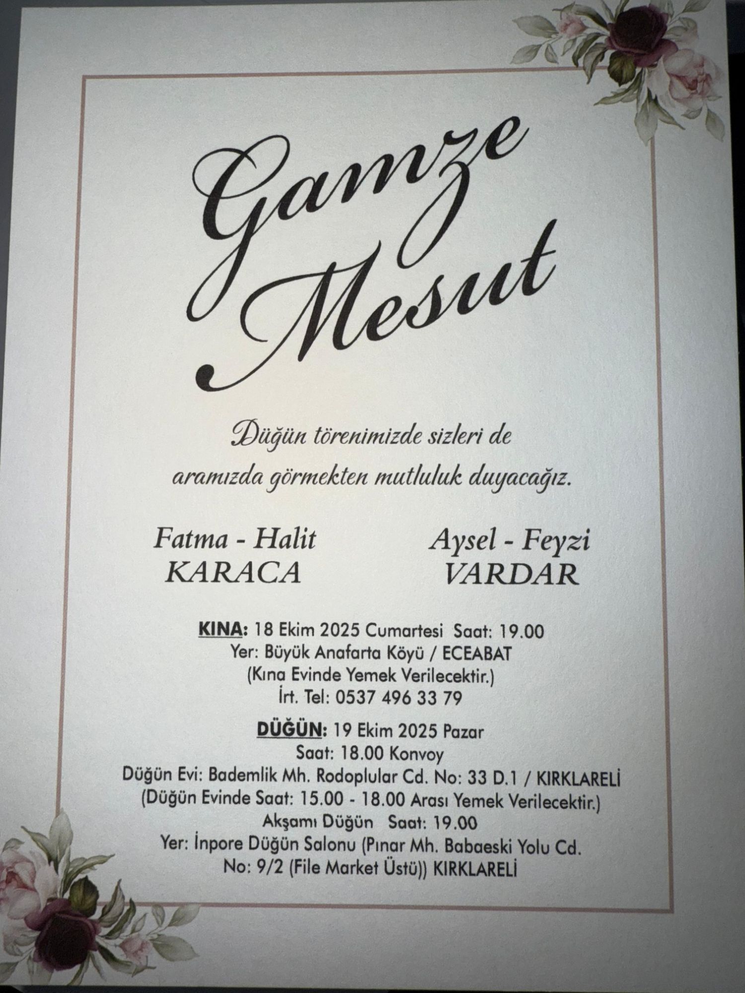DÜĞÜN: 19 Ekim 2025 Pazar günü 19:00-23:00 saatleri arası Kırklareli İnpore Düğün Balo Kongre Salonu