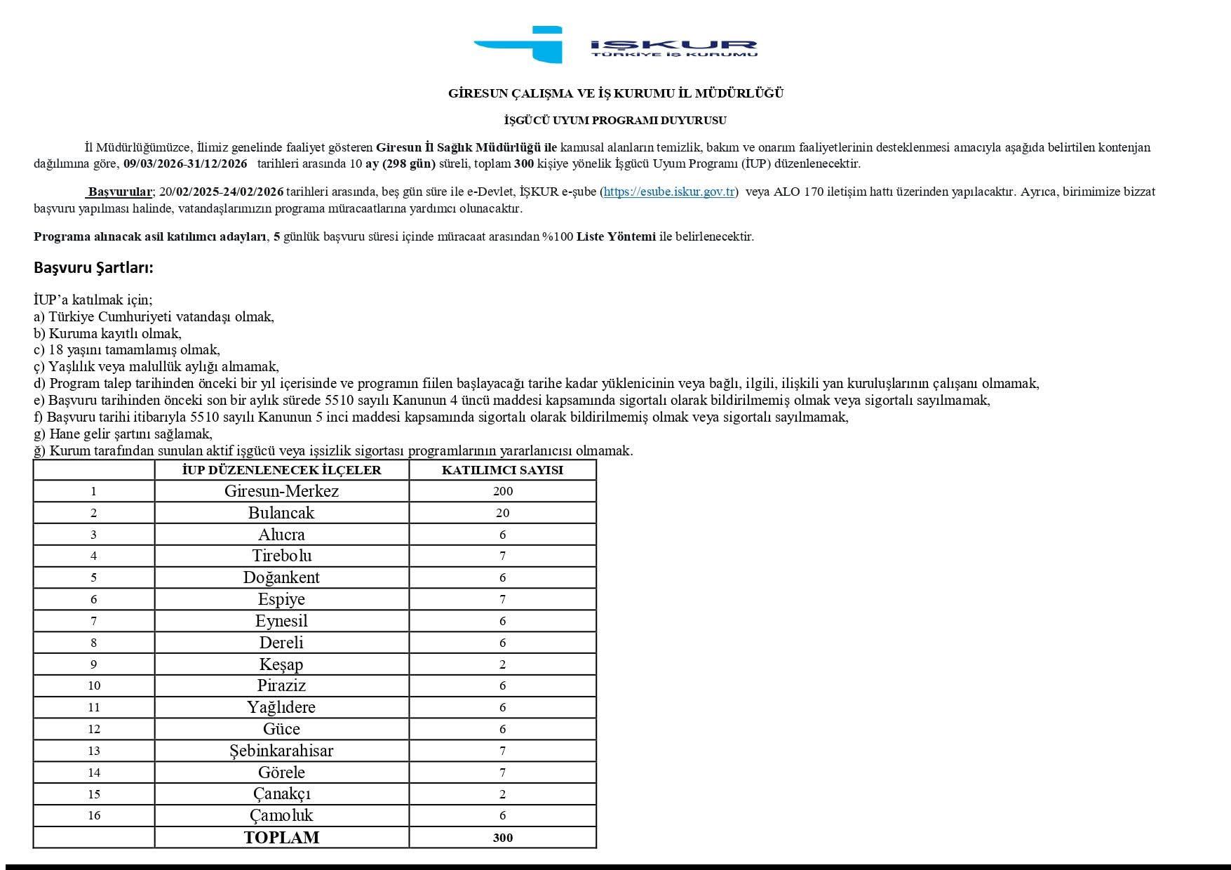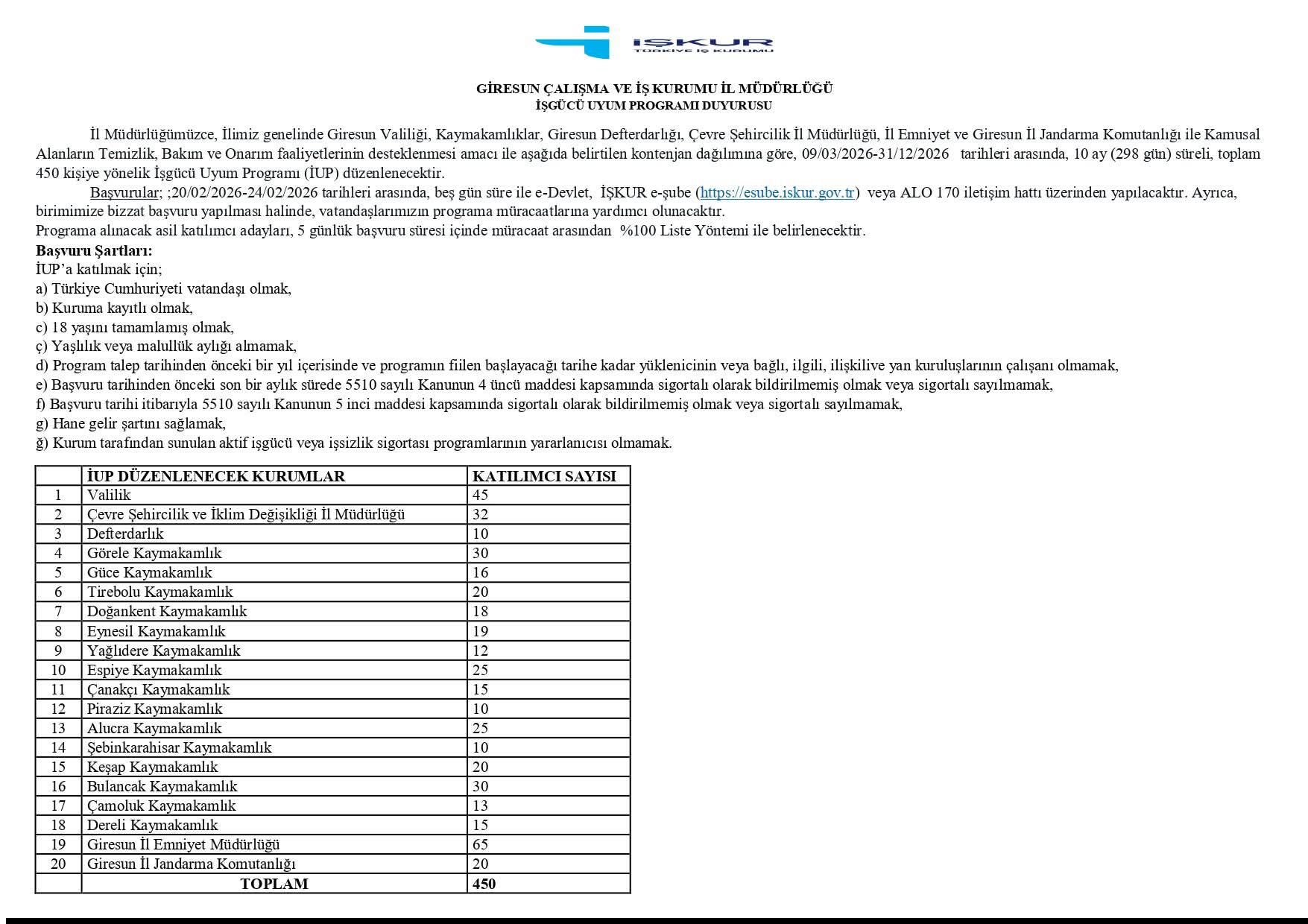 Giresun Valiliği İşkur Üzerinden 450 Kişi Personel Alacak