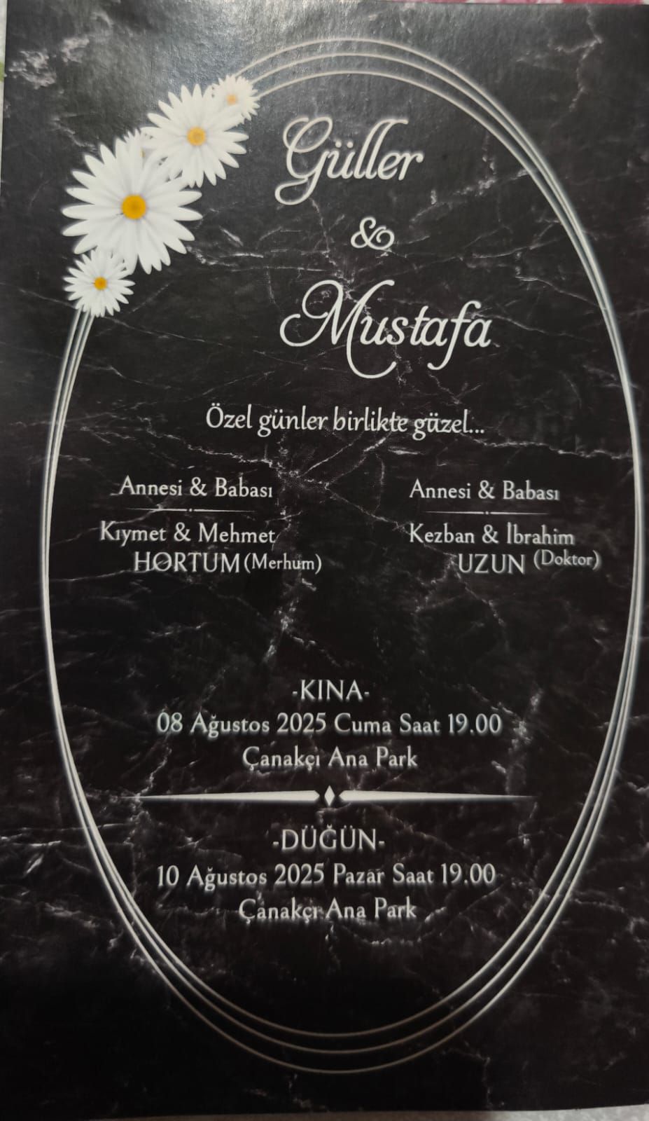 DÜĞÜN:10 Ağustos 2025 Pazar günü 19:00-23:00 saatleri arası Çanakçı Ana Park’ta olacaktır
