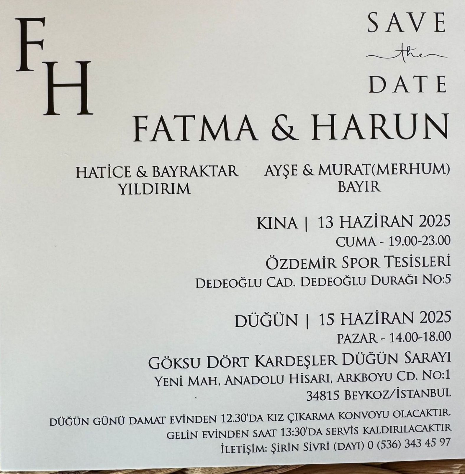 DÜĞÜN:15 Haziran 2025 Pazar günü 14:00-18:00 saatleri arası Dört Kardeşler Düğün Salonunda olacaktır.