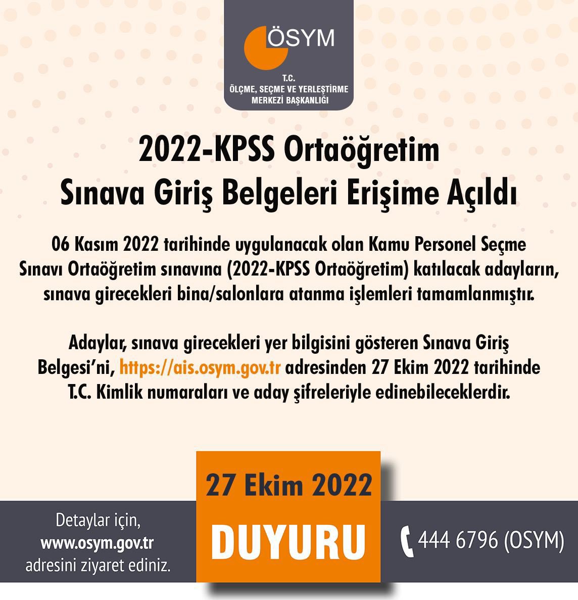 ?Adaylara sınav Giriş Belgesi gönderilmeyecektir.?Adaylar ais.osym.gov.tr web sitesi üzerinden Sınav Giriş Belgesi çıktısı alarak sınava katılabilecektir.