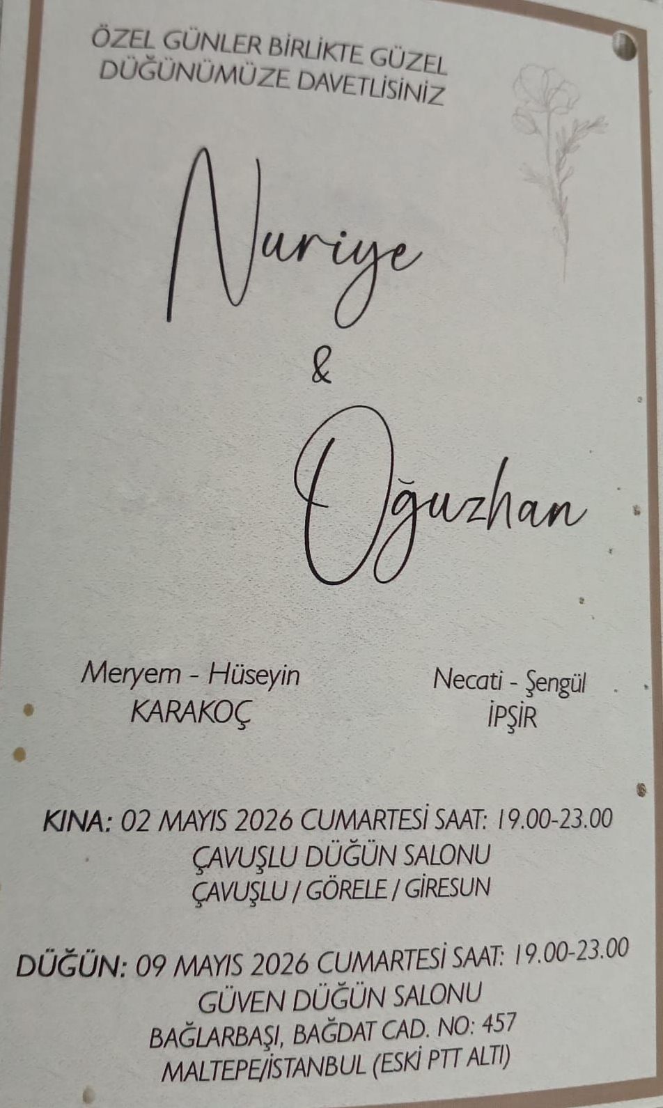 DÜĞÜN: 09 Mayıs 2026 Cumartesi günü 19:00-23:00 saatleri arası Maltepe Güven Düğün Salonu