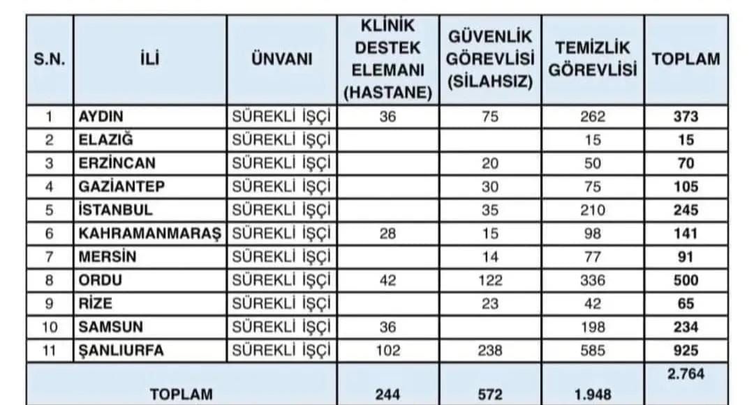 🔹 Sağlık Bakanlığı’na alınacak 2.764 sürekli işçi için il dağılımı belli oldu