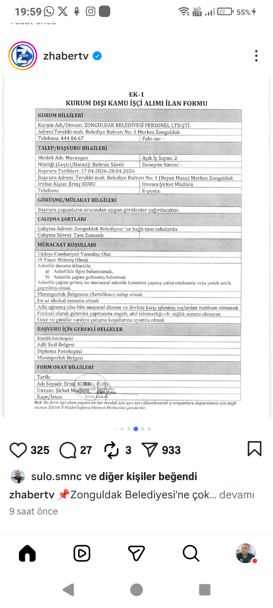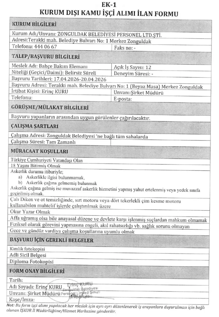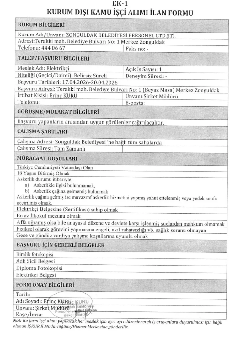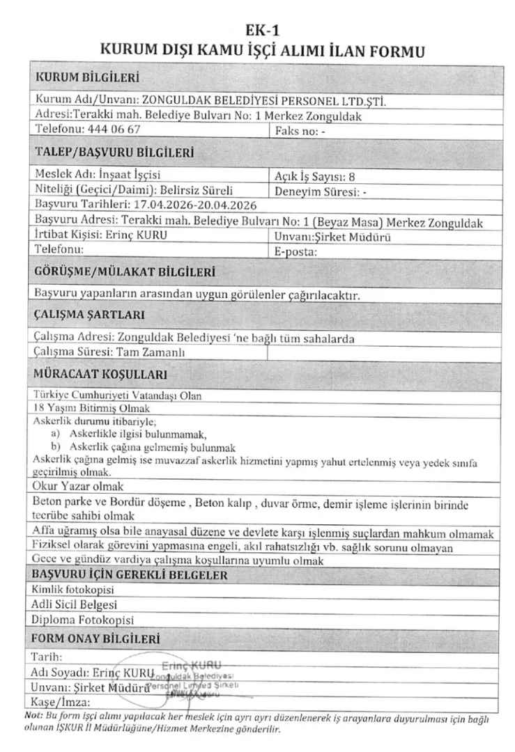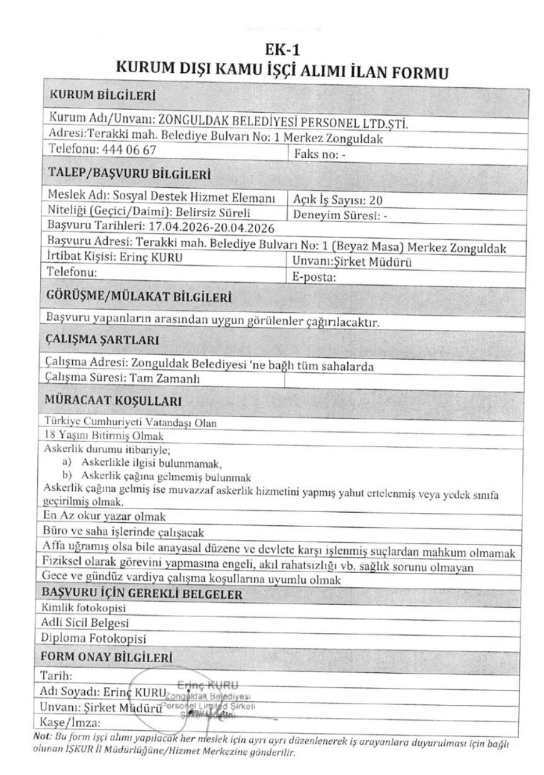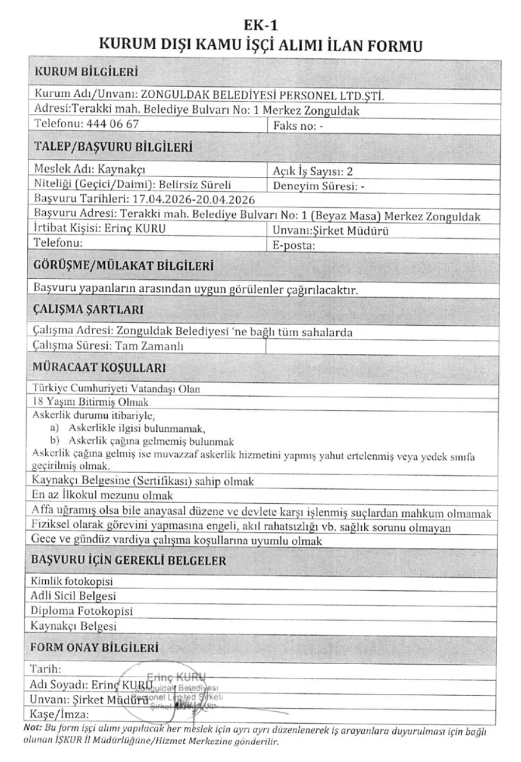 Zonguldak Belediyesi bünyesine çalıştırılmak üzere 45 personel alacak.Zonguldak Belediyesi bünyesine çalıştırılmak üzere 1 elektrikçi, 2 kaynakçı, 2 marangoz, 8 inşaat işçisi, 12 bahçe bakım elemanı, 20 Sosyal Destek Hizmet Elemanı alacak.